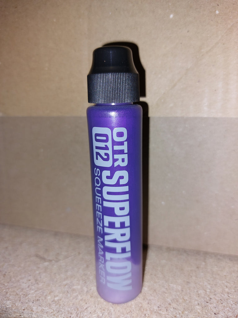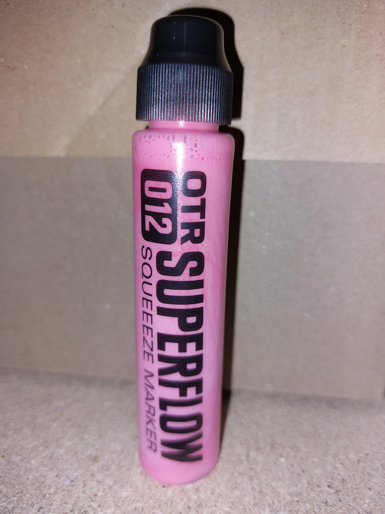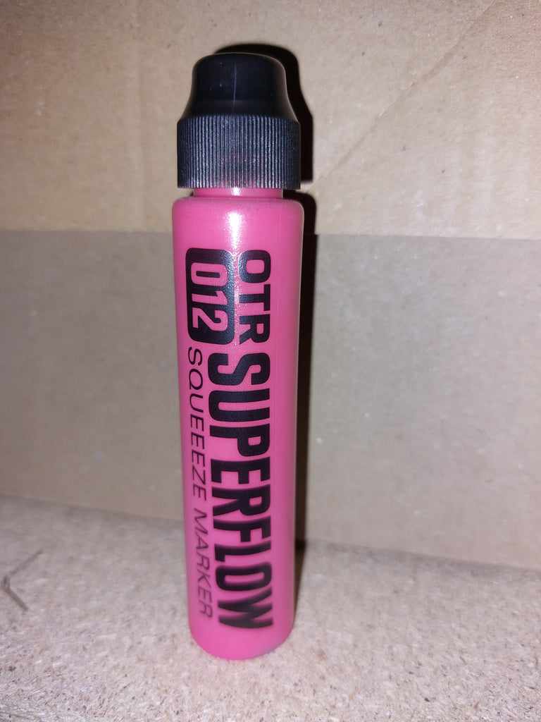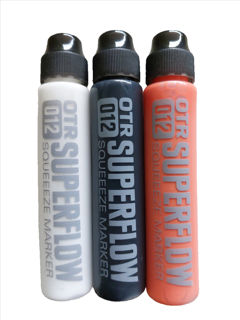 The new OTR.012 SUPERFLOW is a great tool for all street taggers. The squeeze marker combines the soft body of the famous OTR.005 for perfect flow-control with a very robust 10mm nylon round-tip; ideal for any writable surface, both rough and polished. Filled with 30ml alcohol-based black OTR permanent ink or colored 902 paint, the OTR.012 SUPERFLOW is a perfect pocket-marker for any day and night time mission. The new nylon-round tip offers a higher paint or ink flow than many other squeezemarkers and guarantees juicy drippy tags!